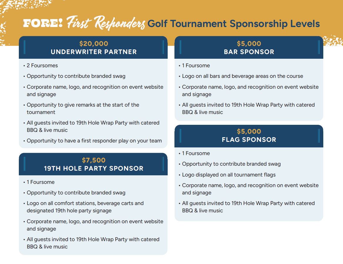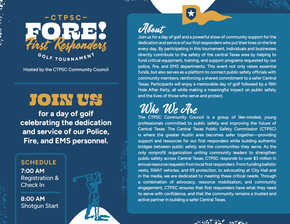 Join us for a day of golf and a powerful show of community support for the dedication and service of our first responders who put their lives on the line every day. By participating in this tournament, individuals and businesses directly contribute to the safety of the central Texas area by helping to fund critical equipment, training, and support programs requested by our police, fire, and EMS departments. This event not only raises essential funds, but also serves as a platform to connect public safety officials with community members, reinforcing a shared commitment to a safer Central Texas. Participants will enjoy a memorable day of golf followed by a 19th Hole After Party, all while making a meaningful impact on public safety and the lives of those who serve and protect.